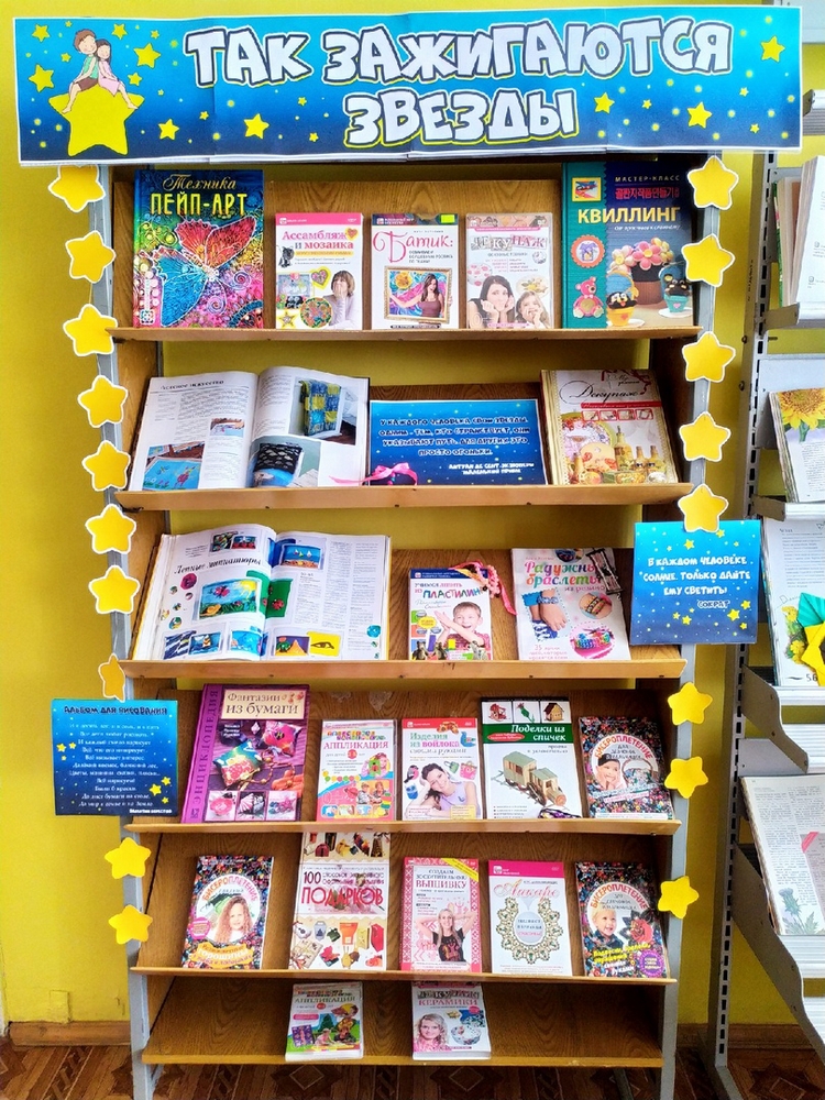 Детское творчество – это отличный способ для ребенка проявить себя, направить нерастраченную энергию в «мирное» русло, при том что каждому ребенку делать что-то своими руками не просто нравится – это всегда приносит ему мегаудовольствие. Любовь к творчеству в любых проявлениях, во всех возрастах способствует формированию целостной, гармоничной и разноплановой личности. В Детской библиотеке им. А. М. Береснева (б-р Строителей, 7) открылась выставка «Так зажигаются звезды», посвященная детскому творчеству. На выставке представлены DVD-диски с мастер-классами по различным техникам прикладного искусства, а также книги, где рассказывается, что такое декупаж, стиль пейп-арт, квиллинг и многое другое. Выставка будет доступна до середины марта.
