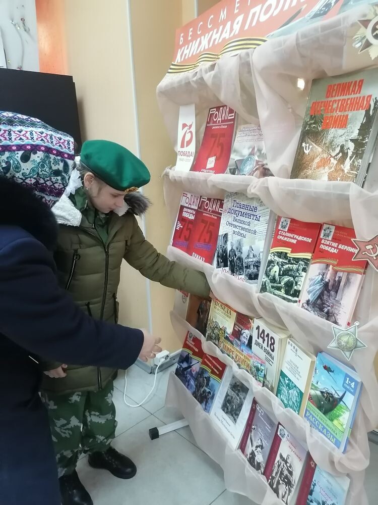 Сотрудники библиотеки в фойе Дворца Культуры оформили две тематические выставки: «Мир защитивших, помнить все должны» и «Бессмертная книжная полка». На выставках была представлена документальная и художественная литература о Великой Отечественной и Афганской войнах, а также издания о военной технике и оружии.