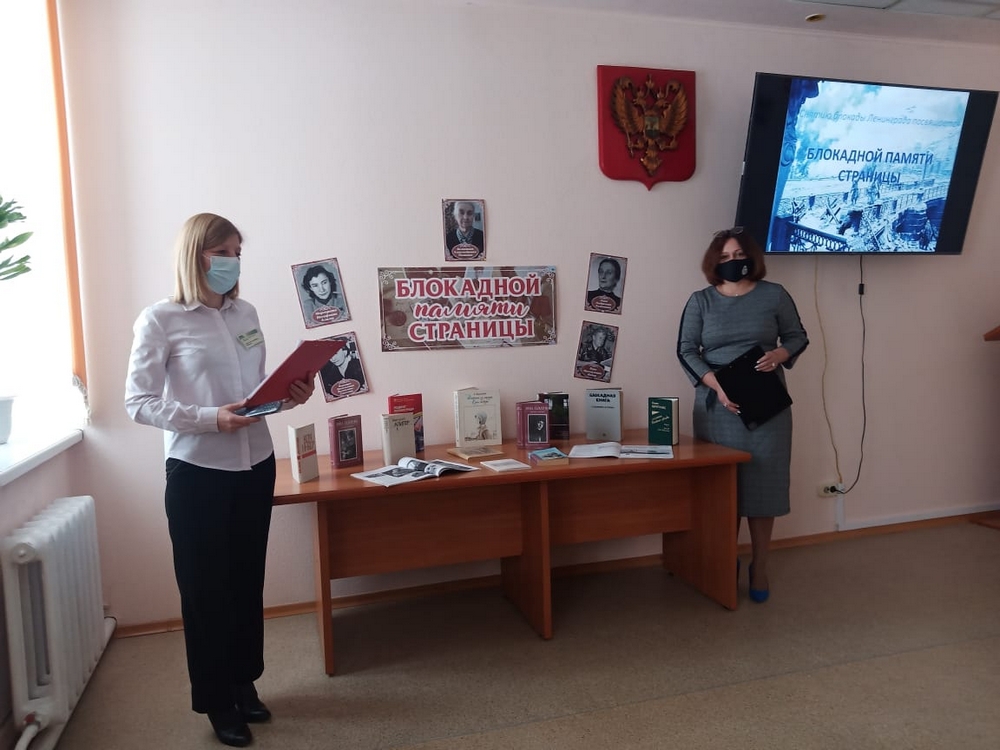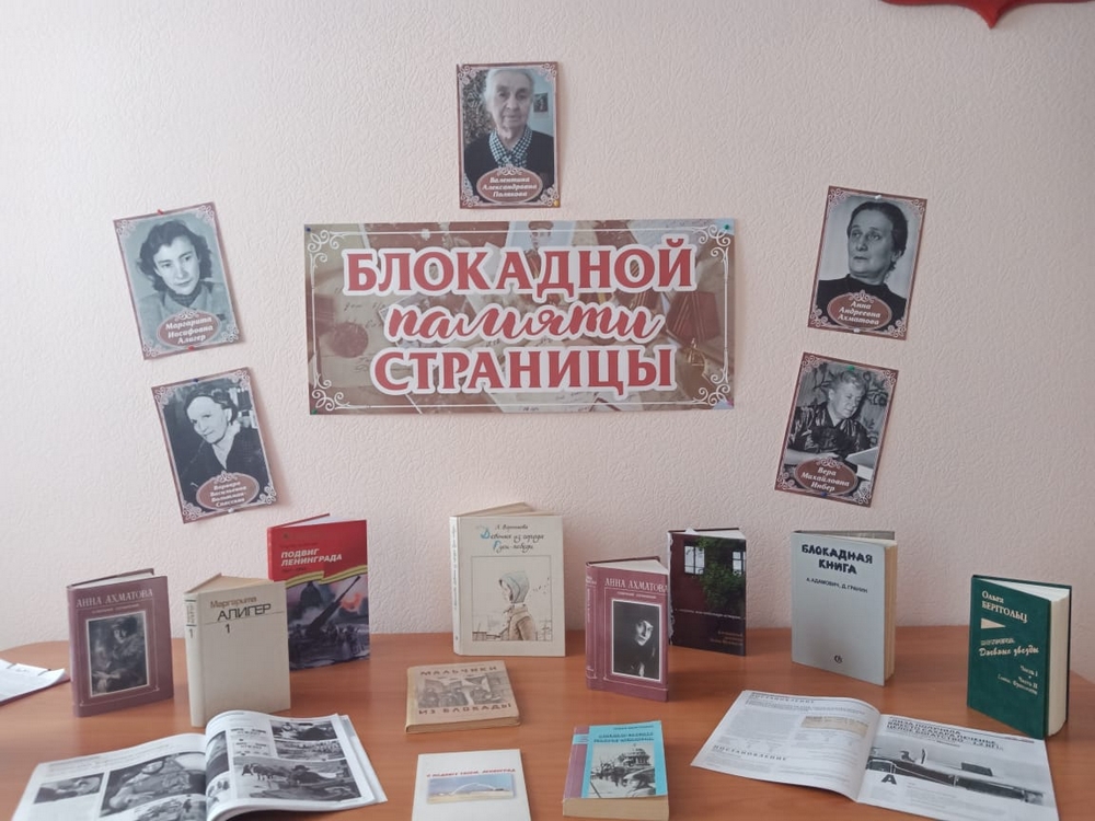 Вниманию читателей была представлена книжная выставка «Блокадной памяти страницы», центральное место в которой заняли книги: «Блокадная книга» Даниила Гранина, Блокадный дневник Лены Мухиной «Сохрани мою печальную историю…», «Записки блокадного человека» Лидии Гинзбург, сборники стихотворений Анны Ахматовой. Большой интерес среди читателей вызвали отрывки из дневника поэтессы Ольги Берггольц, ставшей для многих ленинградцев олицетворением стойкости и мужества.