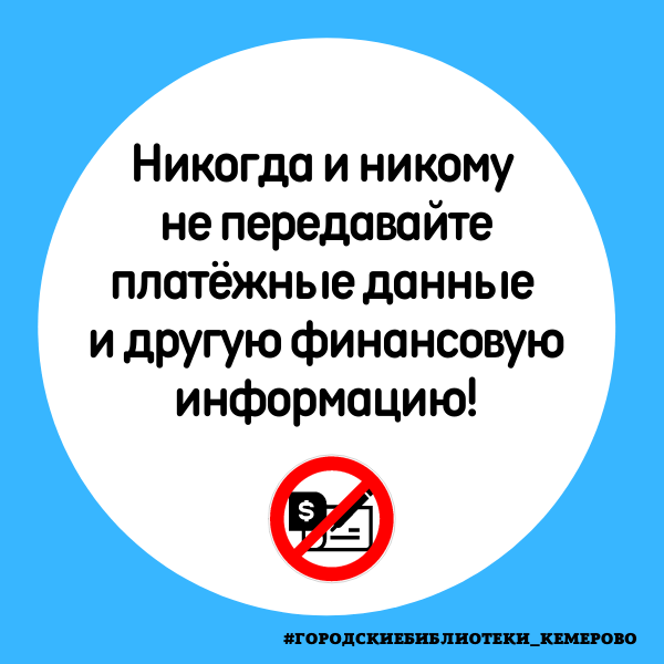 • Никогда и никому не передавайте платёжные данные – код на обороте банковской карты, код подтверждения операции и другую финансовую информацию.