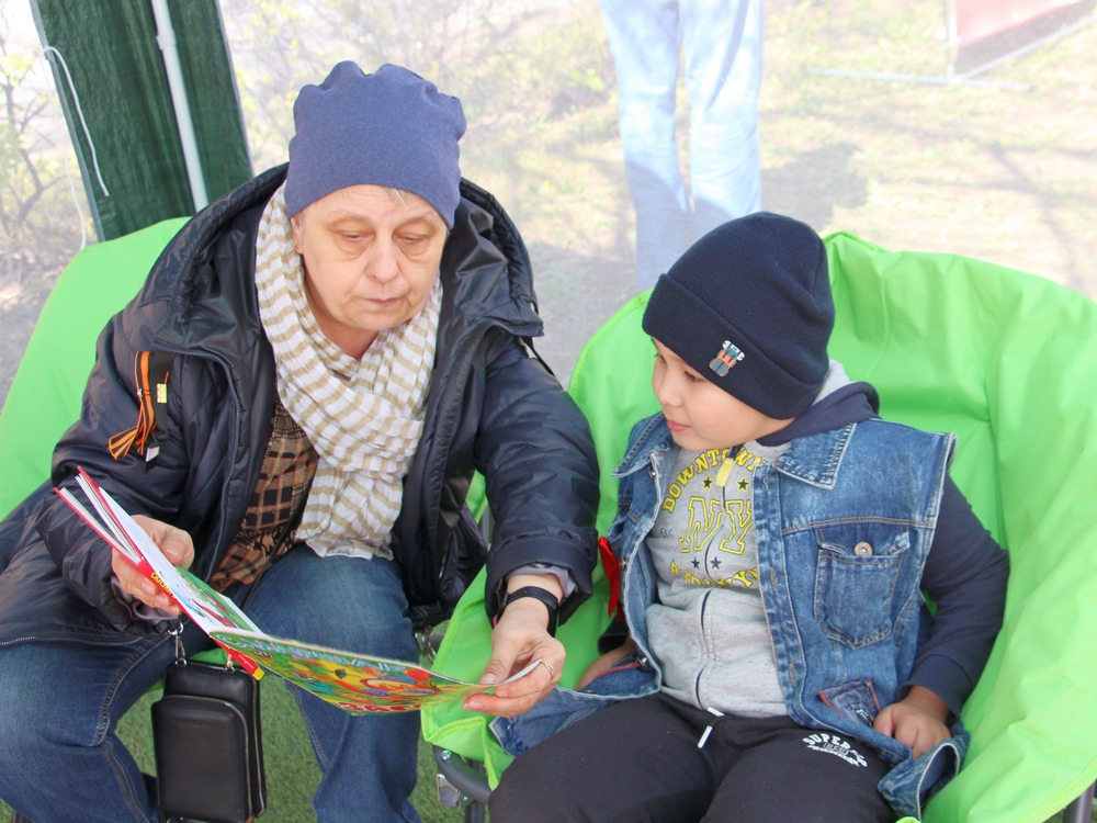 В читальном зале библиотекари читали детям вслух рассказы о войне и загадывали загадки на военную тему. Все желающие могли самостоятельно почитать выбранную литературу, удобно расположившись в нашем шатре.
