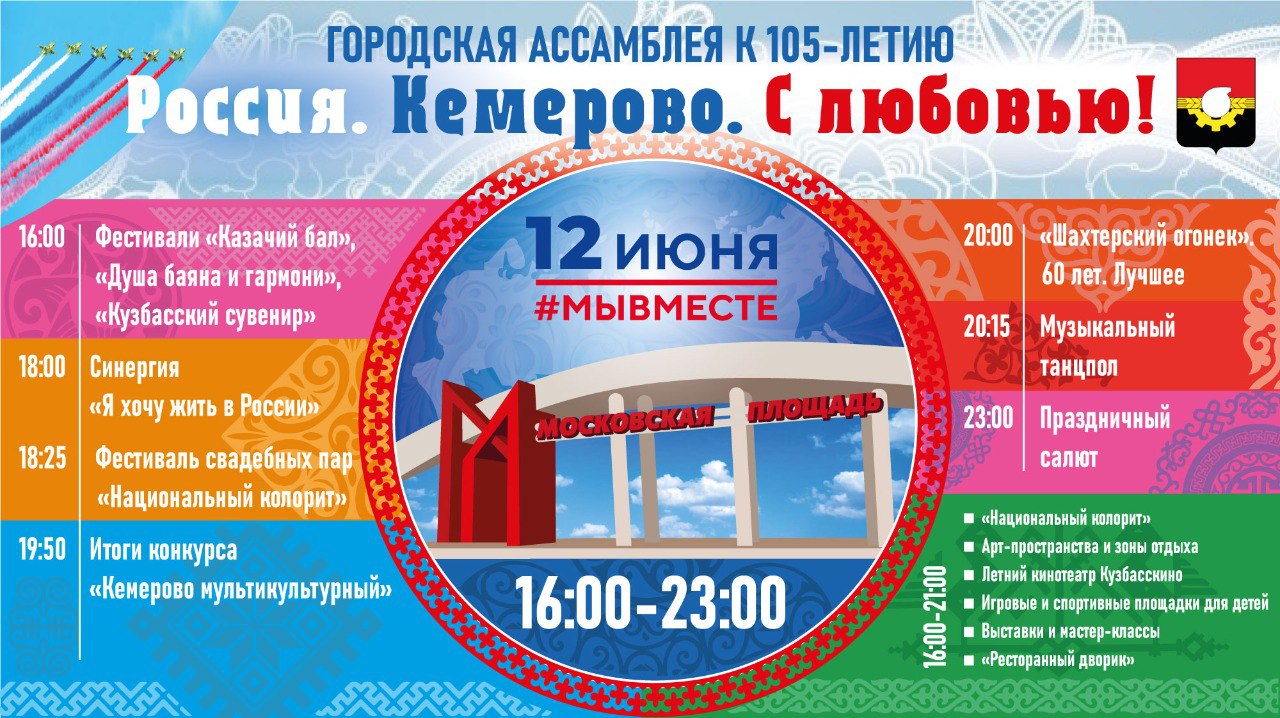 12 июня с 16:00 до 23:00 часов на Московской площади состоятся праздничные мероприятия, посвященные Дню России и Дню города Кемерово, которому в этом году исполняется 105 лет!