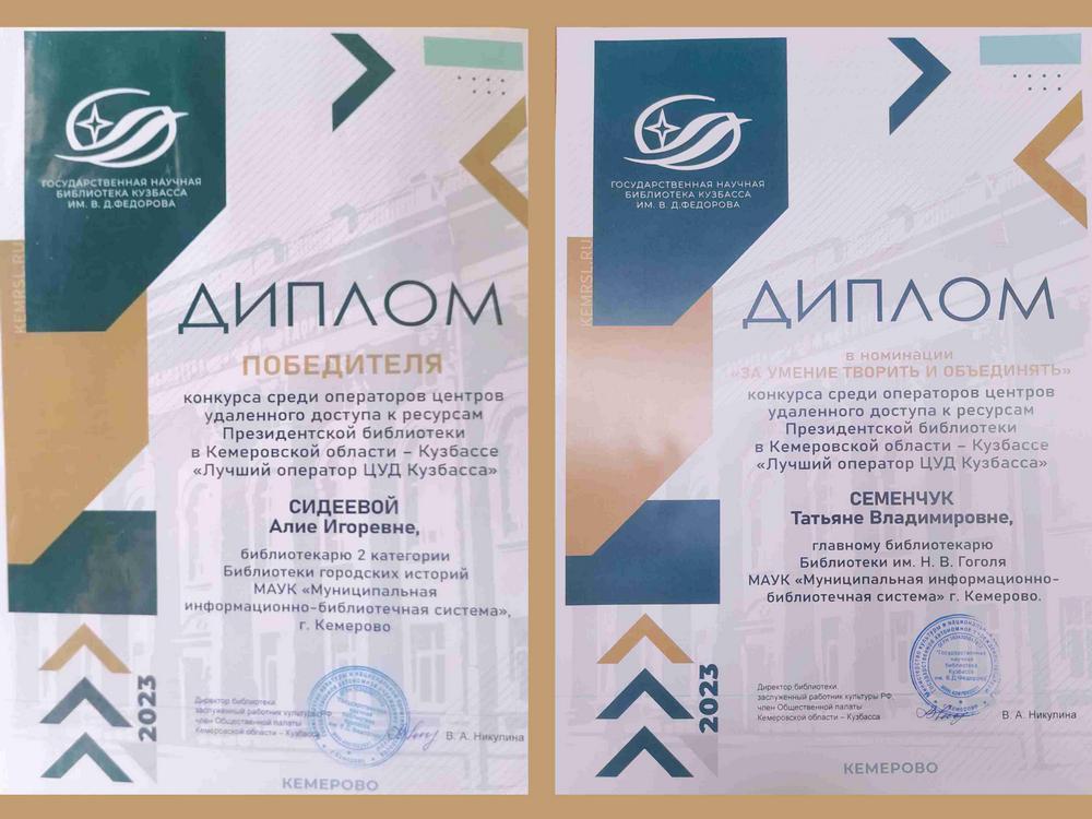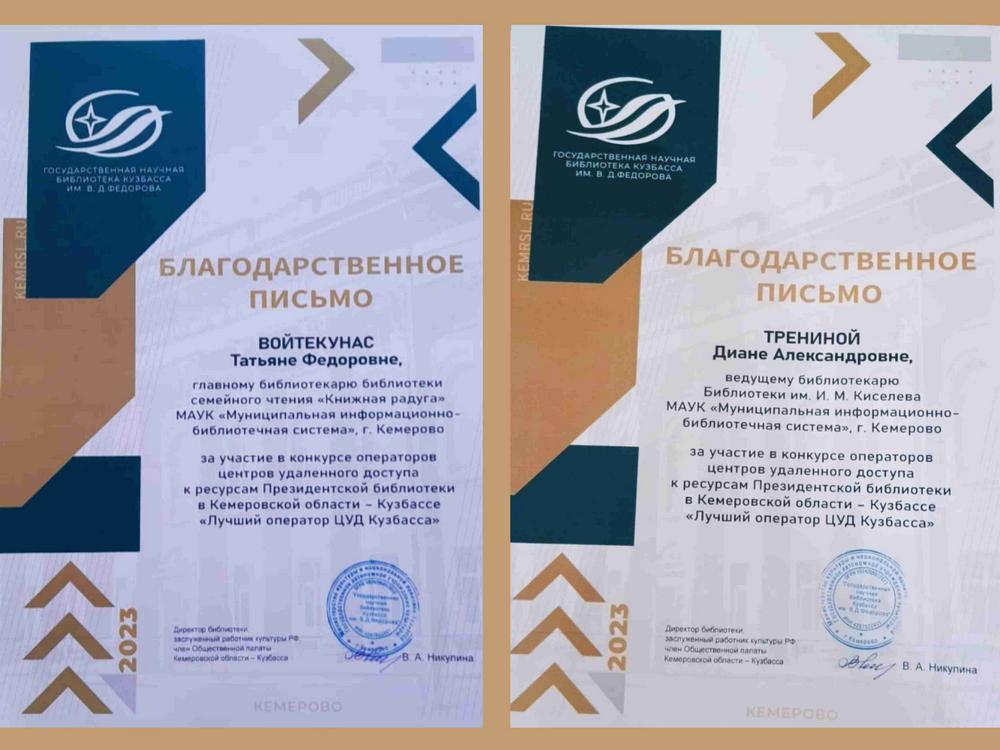 21 декабря 2023 года в Государственной научной библиотеке Кузбасса им. В. Д. Федорова были подведены итоги конкурса среди Центров удаленного доступа Кемеровской области – Кузбасса к ресурсам Президентской библиотеки «Лучший оператор ЦУД Кузбасса», где состоялось награждение победителей и вручение дипломов.
