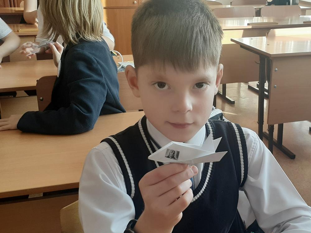Сюрпризом для школьников стал мастер-класс по изготовлению самолета-истребителя в технике оригами. На самолет в том месте, где должна располагаться кабина пилота дети приклеили портрет Валерия Петровича Чкалова. Самолеты получились очень красивые и аккуратные.