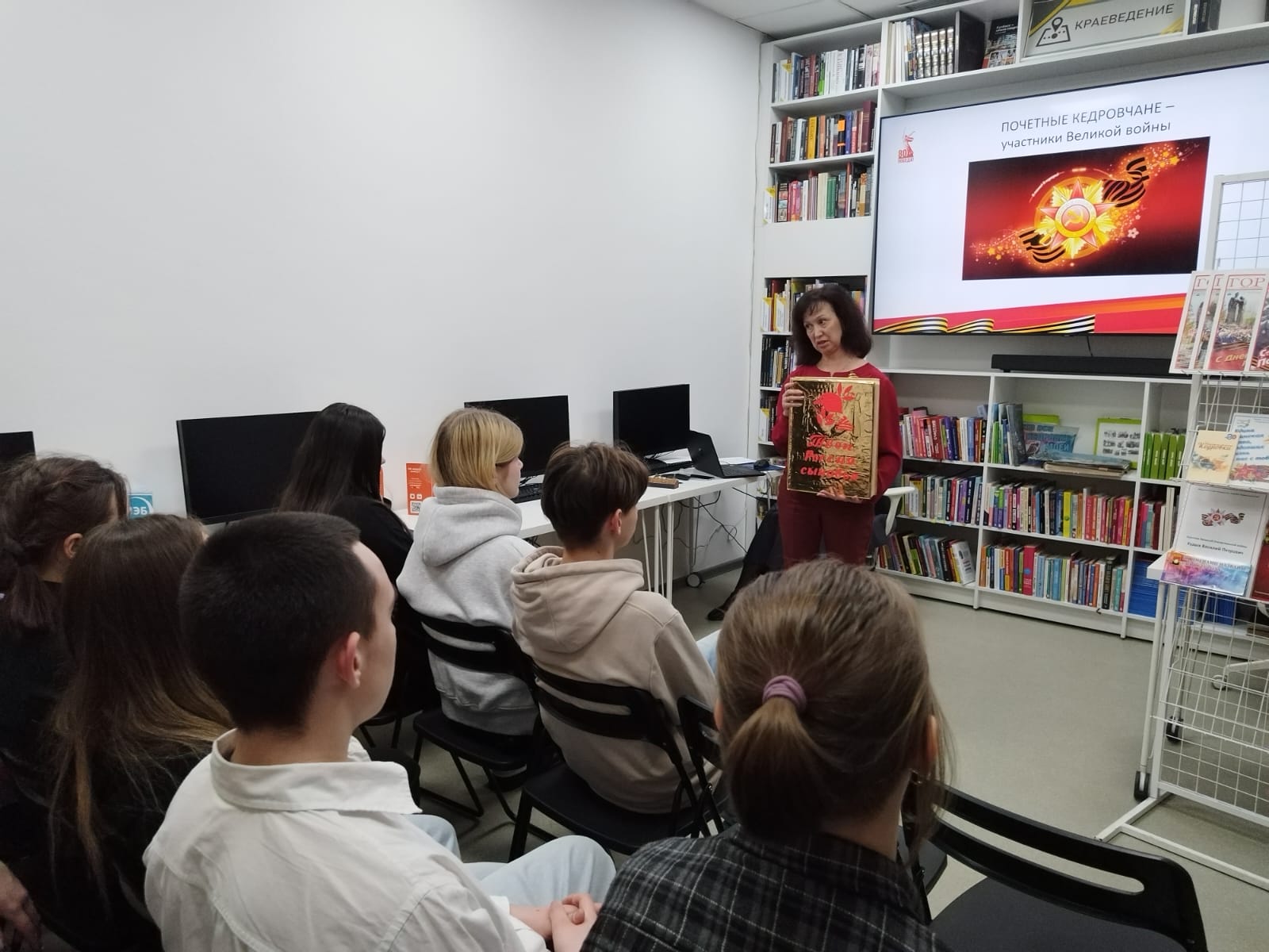 11 марта 2025 г. в библиотеке «Книжная радуга» прошел урок-экскурсия «Знаем героев» для старшеклассников школы №96. Учащиеся познакомились с памятниками жилого района Кедровка: «Парк Победы», «Мемориал погибшим в годы Великой Отечественной войны», «Аллея ветеранов», узнали о Почетных кедровчанах-участниках Великой Отечественной войны и о Герое Советского Союза Брюханове Степане Степановиче, в честь которого названа улица в жилом районе Кедровка. Для закрепления материала, ребята приняли участие в игре «Сапер», где в матрице были зашифрованы фамилии кедровчан – ветеранов Великой Отечественной войны. В задании «Граната», воспользовавшись шифром Цезаря, школьники рассекречивали названия памятных мест Кедровки.