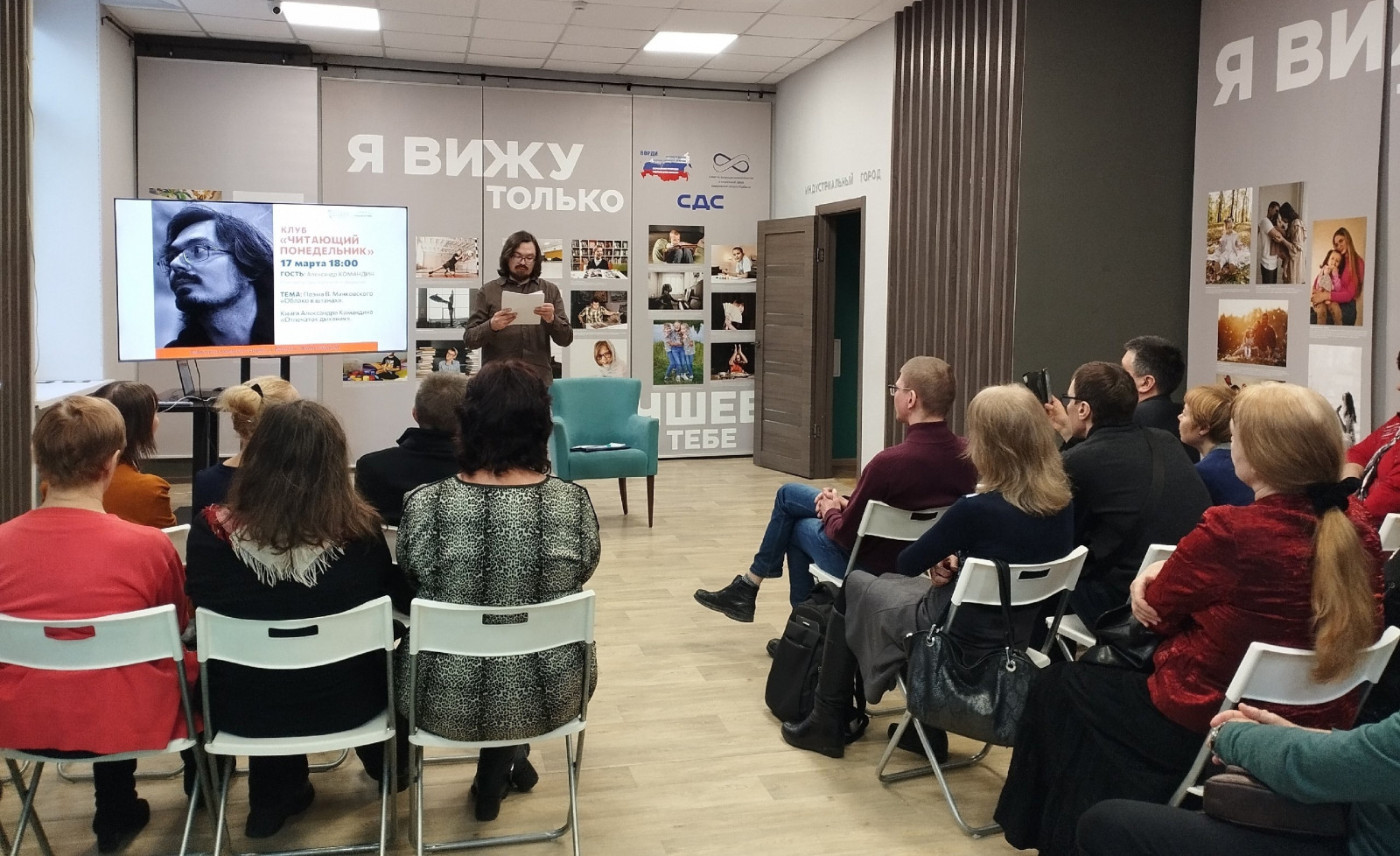 17 марта в Библиотеке городских историй (ул. Весенняя, 7) прошло собрание клуба «Читающий понедельник». Это мероприятие предназначено для тех, кто любит читать и обсуждать литературу. Организаторами и ведущими клуба являются Александр Мухарев и Сергей Верховод. Гостем встречи выступил Александр Командин – поэт, автор трех сборников стихотворений: «Комната без стен», «Перестановка воздуха» и «Детвора облаков». Главной темой обсуждения стала поэма поэта-футуриста Владимира Маяковского «Облако в штнах». Александр Командин представил публике и свои новые стихотворения из готовящегося сборника «Отпечаток дыхания». В ходе мероприятия затрагивались темы литературы, творчества и городской среды. Следующая встреча клуба «Читающий понедельник» состоится 7 апреля в 18:00. Гость встречи: Вадим Шиллер – заведующий кафедрой истории КемГМУ Минздрава России, кандидат исторических наук и доцент.