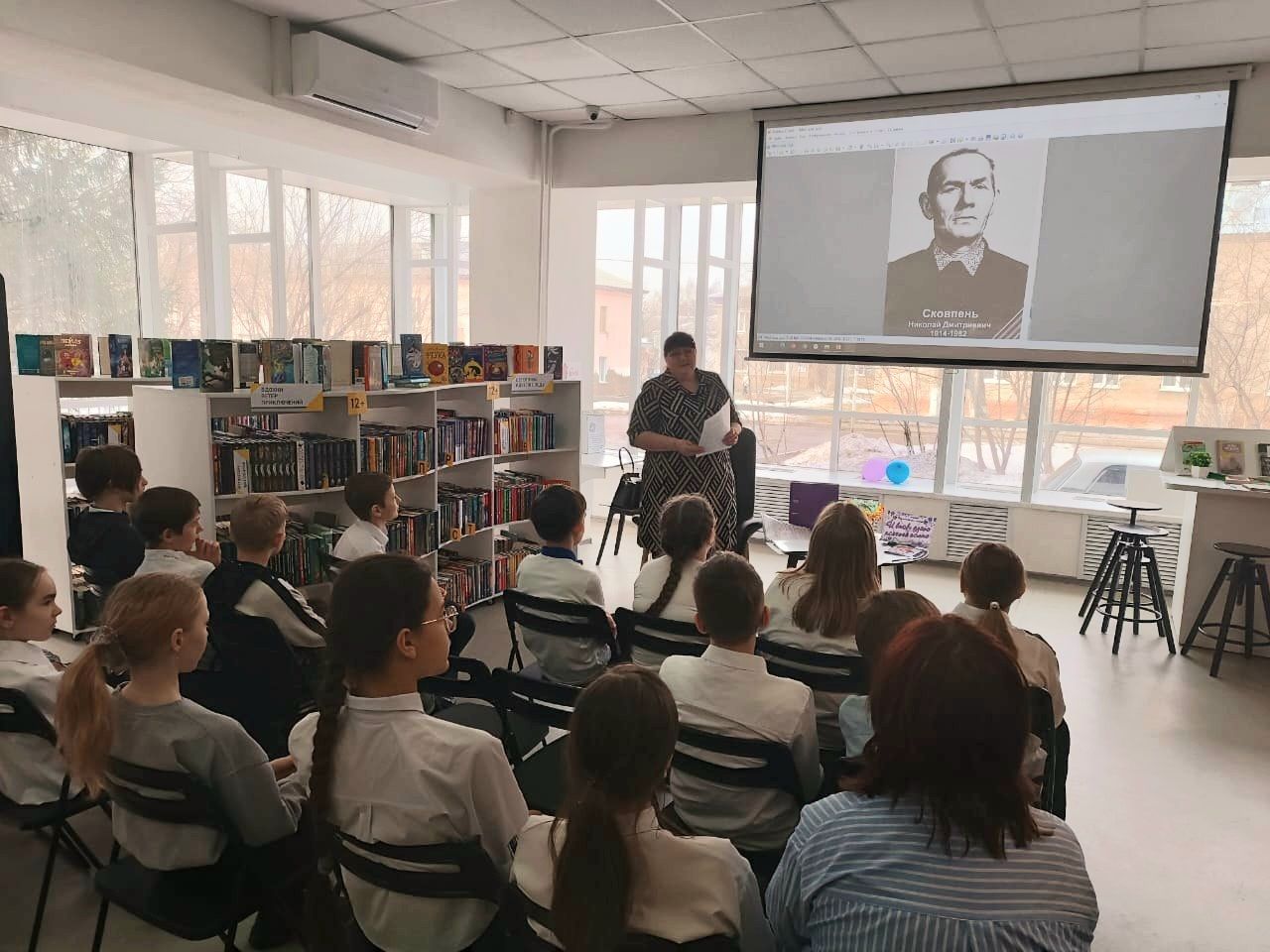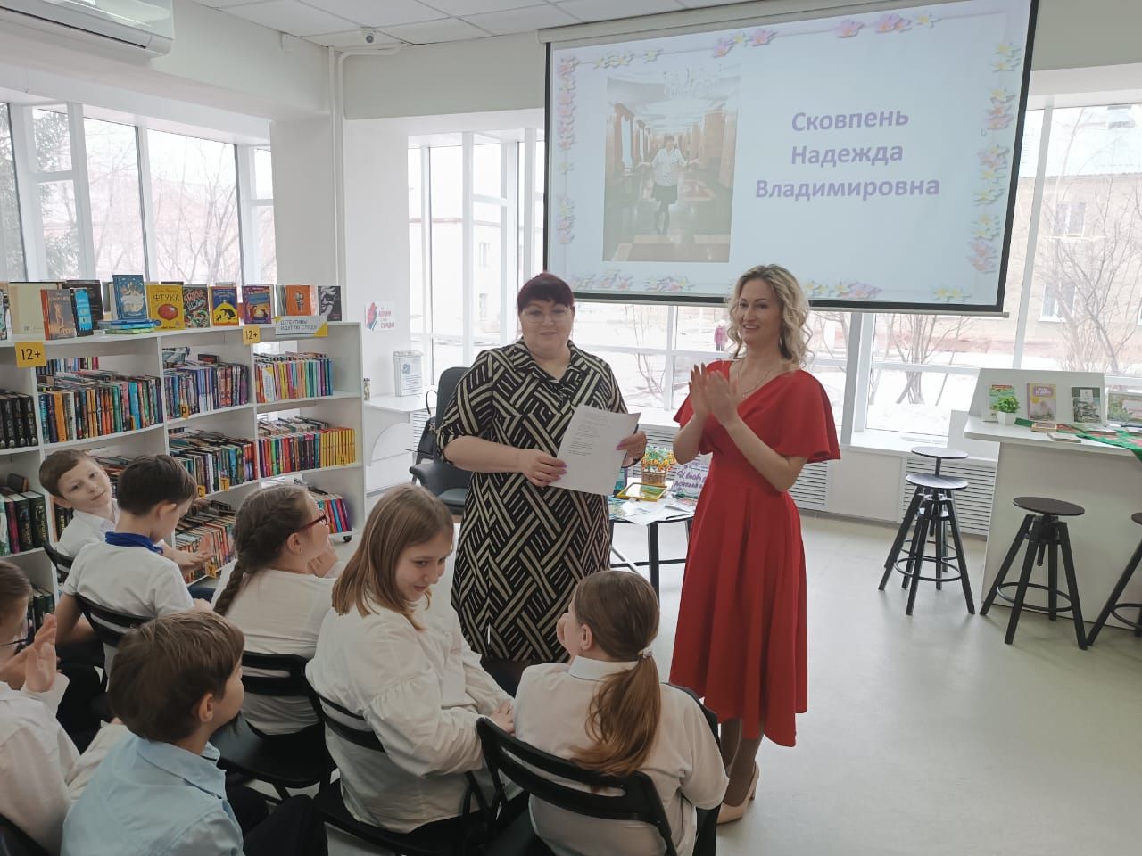 Наш почётный гость – замечательная женщина, наделенная поэтическим даром, оптимистка, активная участница литературного клуба «Вдохновение», победительница районных и городских литературных конкурсов – Сковпень Надежда Владимировна с большим удовольствием поделилась с ребятами своим поэтическим творчеством.