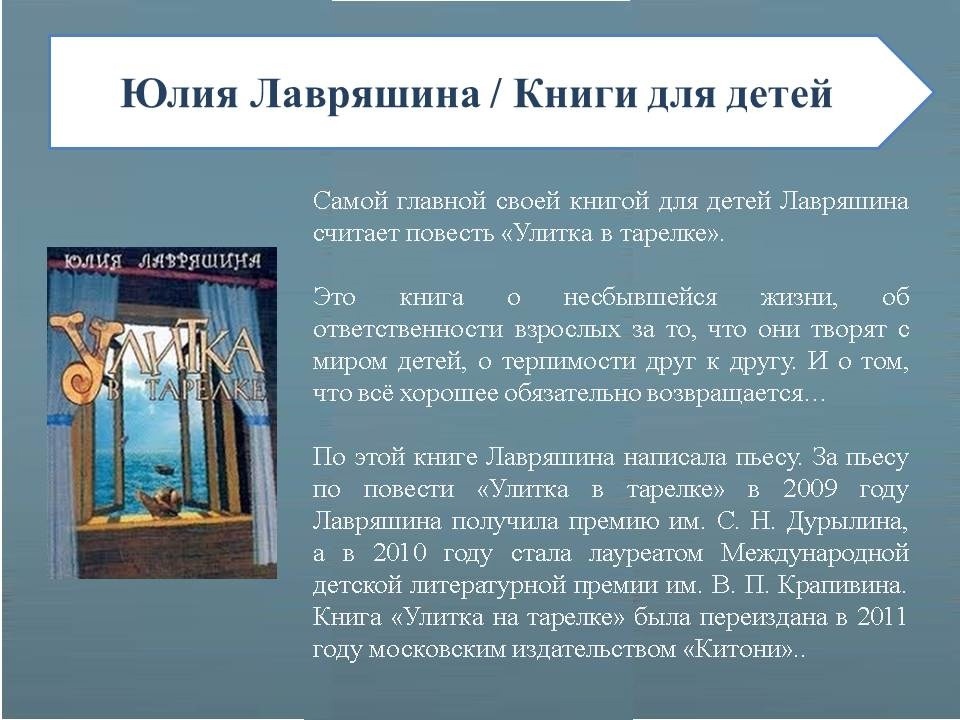 Сочинять начала рано. Лет в семь у нее родился первый цикл стихов, посвященный коту Мишке. В школьные годы писала стихи и прозу, но написанное никому не показывала. Сегодня Юлия Лавряшина - автор более 80 книг, издавалась в Москве, Новосибирске, Кемерово.