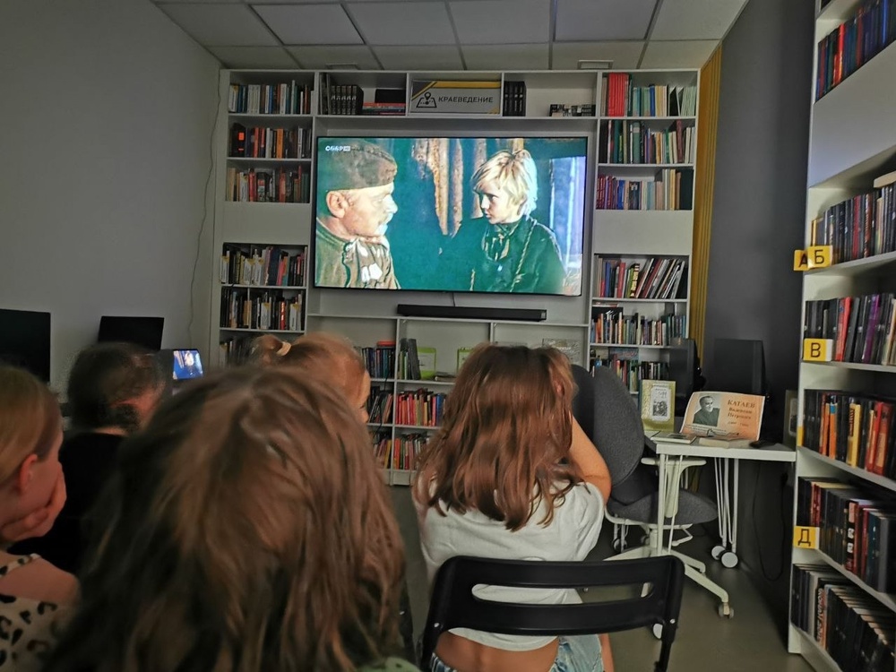 В Библиотеке «Книжная радуга» прошел кинолекторий «Чудо в книге и на экране» художественного фильма «Сын полка», режиссёра Георгия Кузнецова, снятый в 1981 году по одноимённой повести Валентина Петровича Катаева. Валентин Катаев — русский писатель и драматург, прошел Великую Отечественную войну и не понаслышке знал о том горе, которое она принесла нашей стране, лишив тысячи ребят детства. «Сын полка» — яркий, правдивый и трогательный фильм о непростой судьбе двенадцатилетнего мальчика — Вани Солнцева, потерявшего во время войны родных. На протяжении всего фильма наши юные гости, с замиранием сердца, наблюдали за его жизнью. Было видно, что ребята прочувствовали душой, и искренне сопереживали героям, восхищаясь их смелостью, героизмом, великим трудом, несгибаемой волей и огромной любовью к Родине.