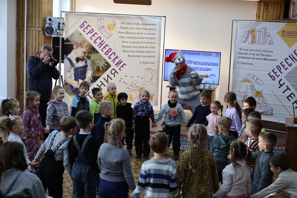 Вместе с котом Василием дети путешествовали по стихам Береснева, играя в «Кошки-мышки», собирая грибы и определяя дары огорода.