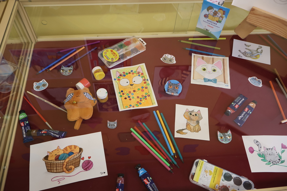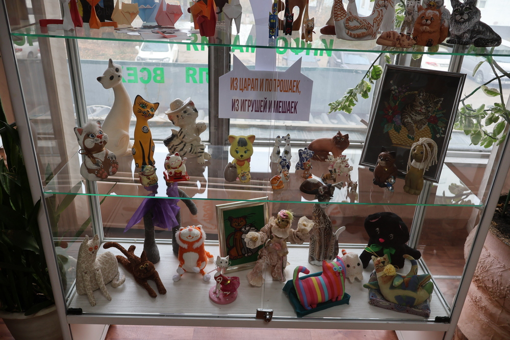 Весь день в библиотеке работали тематические выставки, где можно было познакомиться с книгами о котах, рассмотреть веселые и яркие картины, а также многочисленные разнообразные фигурки котов и кошек.