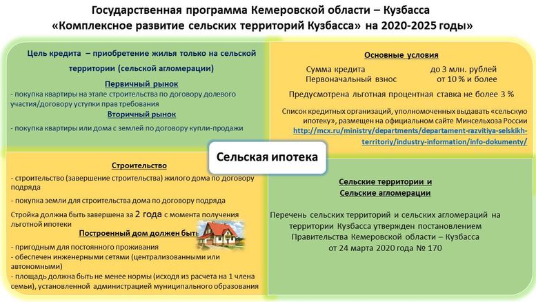 Так, теперь и сельские, и городские жители Кузбасса могут взять ипотеку до 3 млн. рублей под очень низкий процент – до 3 % годовых – сроком до 25 лет, потратить средства на строительство или приобретение жилья в сельской местности. Причем, граждане могут купить жилье в новом доме и на вторичном рынке, а также купить дом с участком или участок и построить на нем дом.