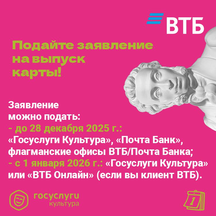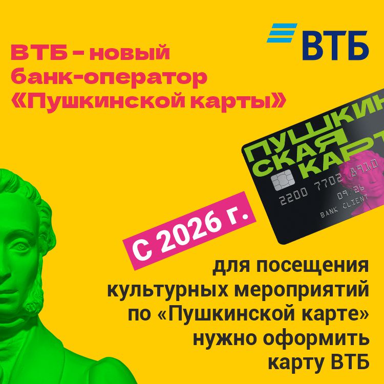 Внимание! С 1 января Банк ВТБ 2026 года станет новым оператором программы «Пушкинская карта», которая реализуется при поддержке нацпроекта «Семья».